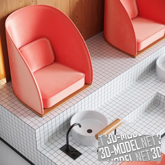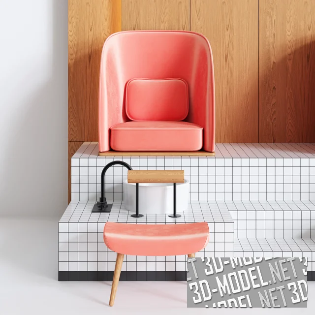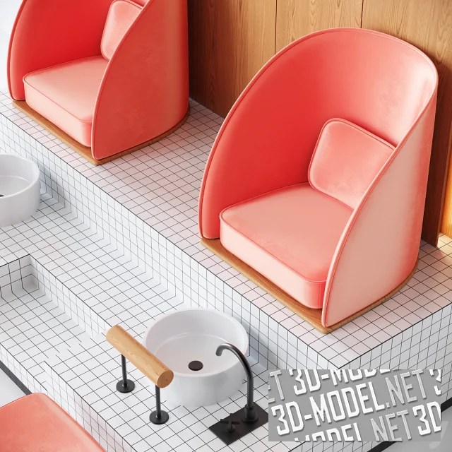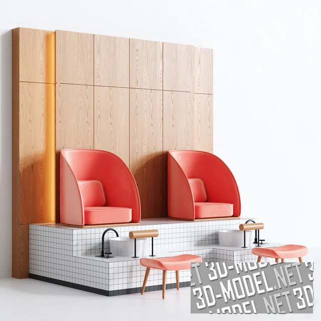 Стильная зона для педикюра, выполненная в современном дизайне. Два удобных кресла в мягкой обивке кораллового цвета расположены на возвышении, облицованном мелкой белой плиткой с контрастными швами. Перед каждым креслом установлена индивидуальная мойка для ног с изящным черным краном и деревянной подставкой для комфортного размещения клиента. Дополняют композицию небольшие пуфы того же оттенка, что и кресла, на деревянных ножках.