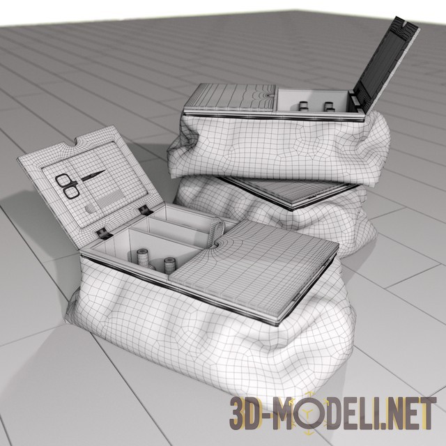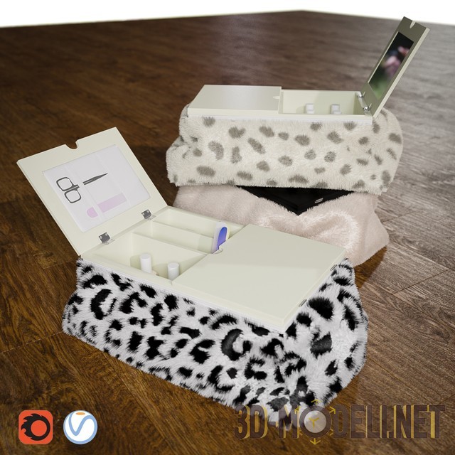 3D модель трех косметичек с разным мехом и внутренним содержимым – это принадлежности для маникюра и косметика. В архиве находятся отдельные файлы для Corona и Vray. Косметички отлично дополнят туалетный столик в интерьере.