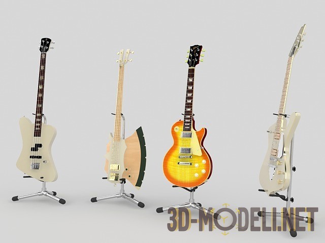 3D-модель набора электрогитар на стойках, в т.ч. известных моделей, Gibson и.т.п. В архив включены текстуры, маски с развертками, материалы на моделях настроены – готовы к использованию.
