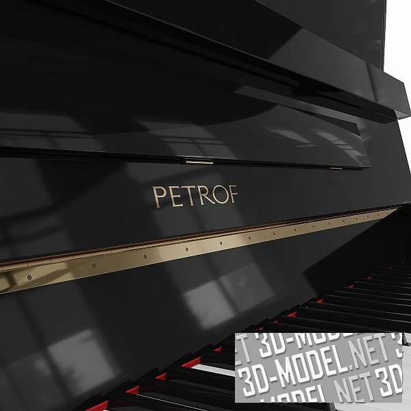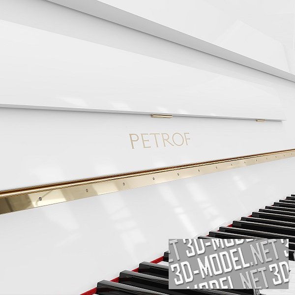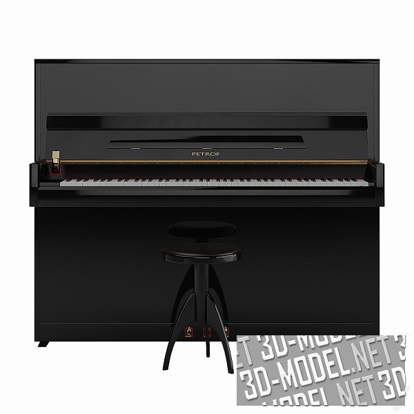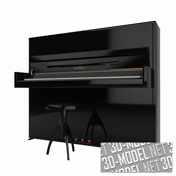 Современное компактное пианино PETROF P 118 S1 в минималистичном стиле, с полной клавиатурой в черном или белом корпусе. Габарит корпуса: 54,5х118х144,3см. К пианино - черный стул Discacciati с поворотно-подъемным механизмом, на трех ножках, с круглым сиденьем.