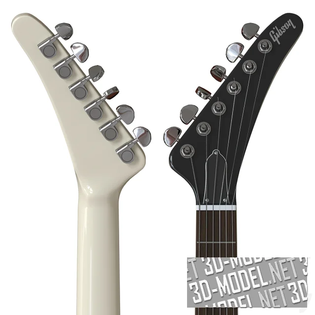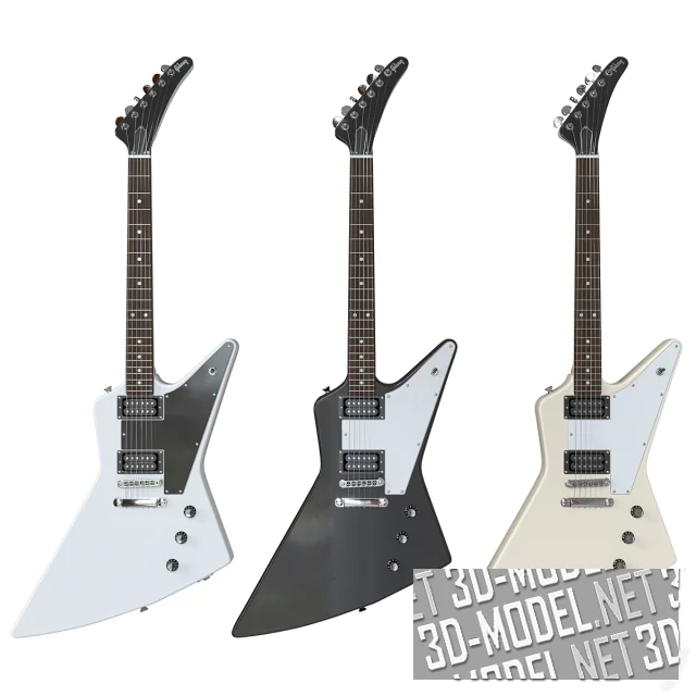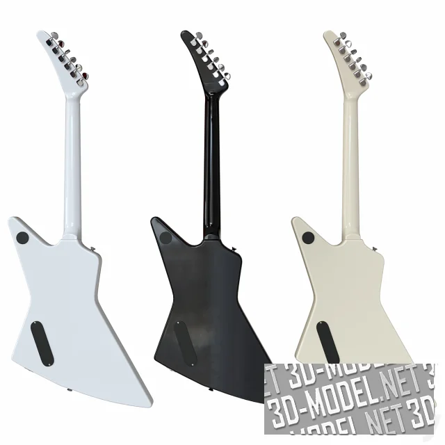 Легендарная модель электрогитары Gibson Explorer в радикально-футуристическом дизайне. Была представлена в 1958 году, с моделью Flying V. В данном варианте гитару стали выпускать с 1976 года. Дека с формой «сапожок» имеет панель, две пары звукоснимателей, три круглые ручки, держатель струн и тумблер. Деки представлены в трех вариантах цвета: белом (с черной панелью) черном и сливочном (с белыми панелями). Накладка на грифе - красное дерево, с белыми точками на ладах. В сцену включены настенное крепление для подвешивания гитары и напольная черная стойка.