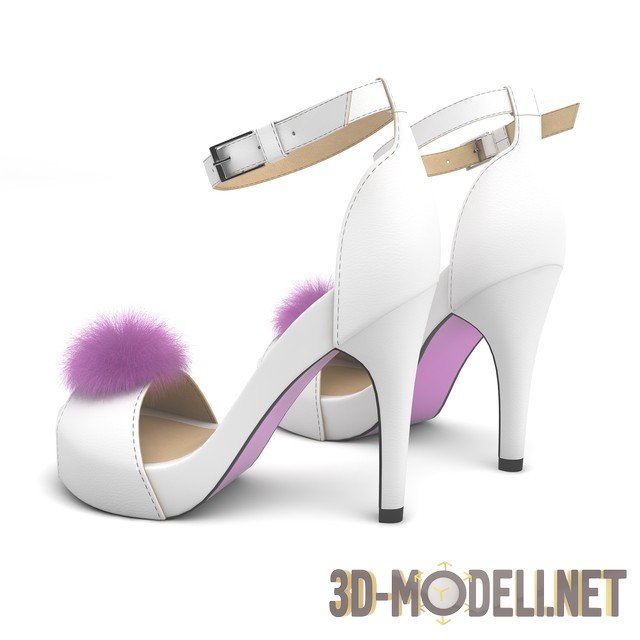 Стильные женские босоножки из коллекции Missguided. Босоножки белого цвета, на высоком каблуке. Смотрятся очень нарядно, игривый штрих придает нежно-сиреневый цвет на внутренней части каблука и такого же оттенка меховой помпон.