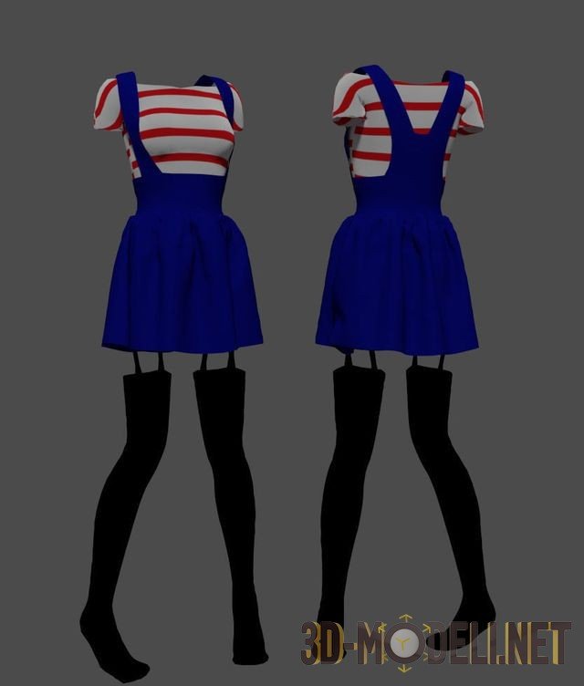 Комплект одежды, который хорошо подойдет для девушки–подростка. Белая блузка с коротким рукавом с редкими и широкими красными поперечными полосами гармонично смотрится с Короткой синей юбкой. Юбка имеет плотную, облегающую планку на талии и лямки. Также комплект включает высокие чёрные чулки с резинками.