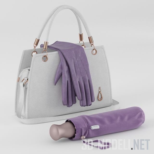 Прекрасный набор для интерьера прихожей - черная дамская сумочка (модель представлена и в белом цвете), с перекинутыми через нее мягкими кожаными перчатками нежно-сиреневого цвета. Зонтик в чехле такого же цвета, как перчатки, идеально дополняет набор.