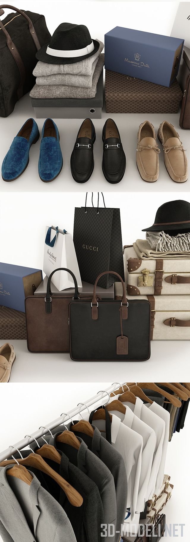 Высококачественный набор одежды для наполнения мужского гардероба: представлены рубашки, пиджаки и штаны на вешалке, сумки, чемоданы, пакеты, обувь и головные уборы.