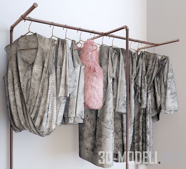 Реалистичная 3d модель комплекта женской одежды на вешалке (в наборе платья, блузки, розовая меховая жилетка и пр.)