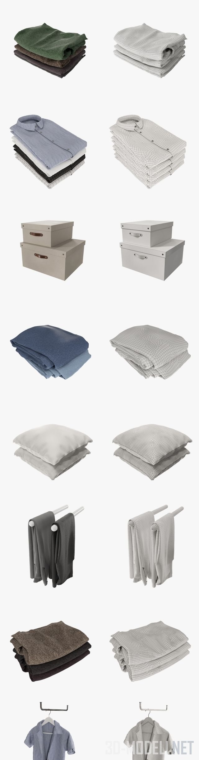 Современный гардероб с мужской одеждой (рубашки, брюки), на вешалках и в сложенном состоянии, коробки. Все модели без применения Turbo Smooth.