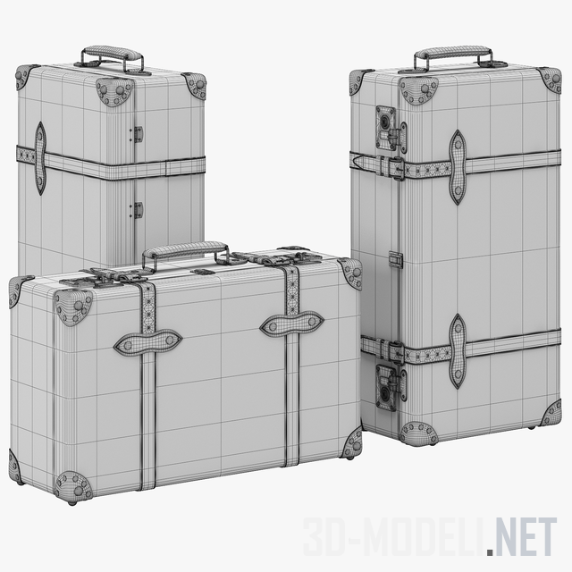 Три чемодана от Globe Trotter. Модели с расположением ручки в вертикальном и горизонтальном положении чемодана. В дизайне чемоданов прослеживается ретро-нотка - изделия обильно украшены декоративными уголками, перетянуты ремнями и оборудованы хромироваными замками-защелками. Представлены красный, темно-синий и темно-серый варианты чемоданов.