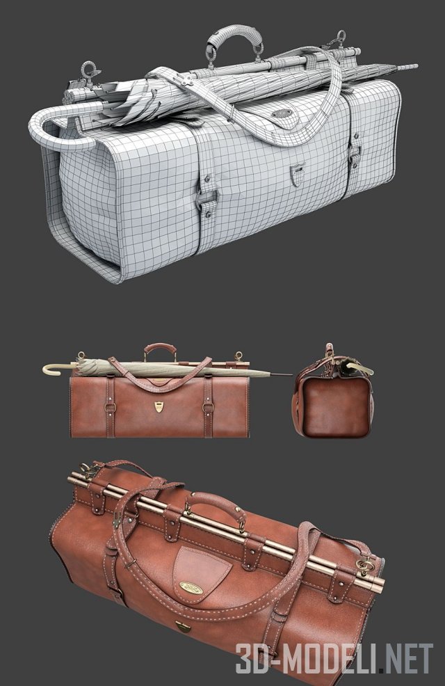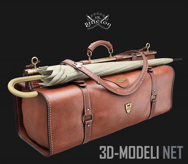 Большая дорожная сумка colonel littleton из кожи коньячного цвета, с латунной фурнитурой и белой декоративной строчкой. На сумке лежит большой бежевый зонт. Эта сумка от американского модельера colonel littleton, известного своей маркой высококлассных изделий из кожи.