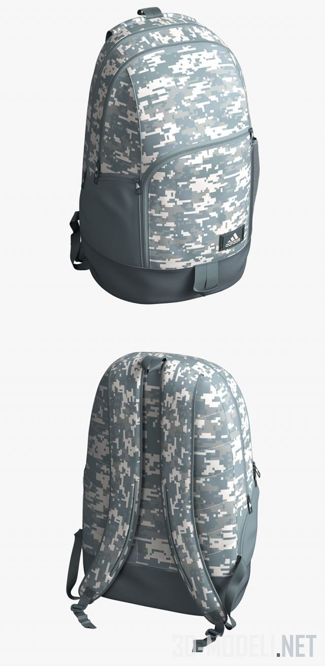 Камуфляжный рюкзак от бренда Adidas. Рюкзак сшит из камуфляжной ткани с бело-серо-голубым рисунком. Лямки, вставки и дно сделаны из красивой серо-голубой кожи.