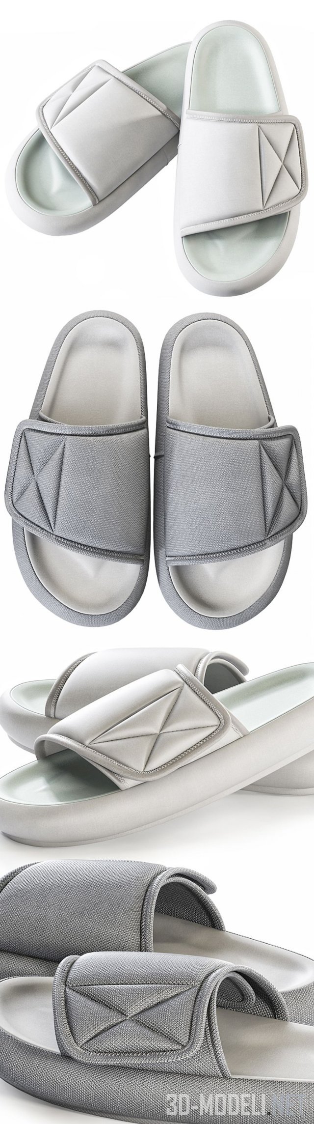 Несколько пар светлых шлепанцев от Kanye West. Домашние тапки в любом проекте создадут ощущение дома и уюта.