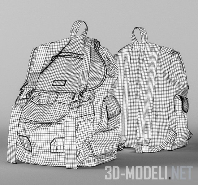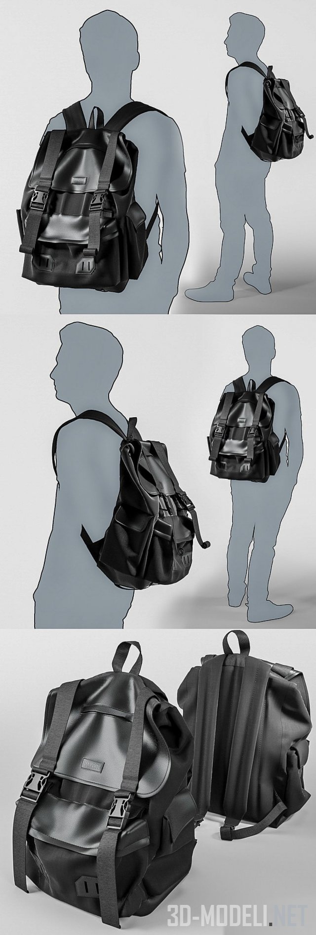 Универсальный черный мужской рюкзак. Рюкзак скомбинирован из кожи и ткани и имеет передний и боковые карманы. Реалистичная трехмерная модель, текстуры в архиве.