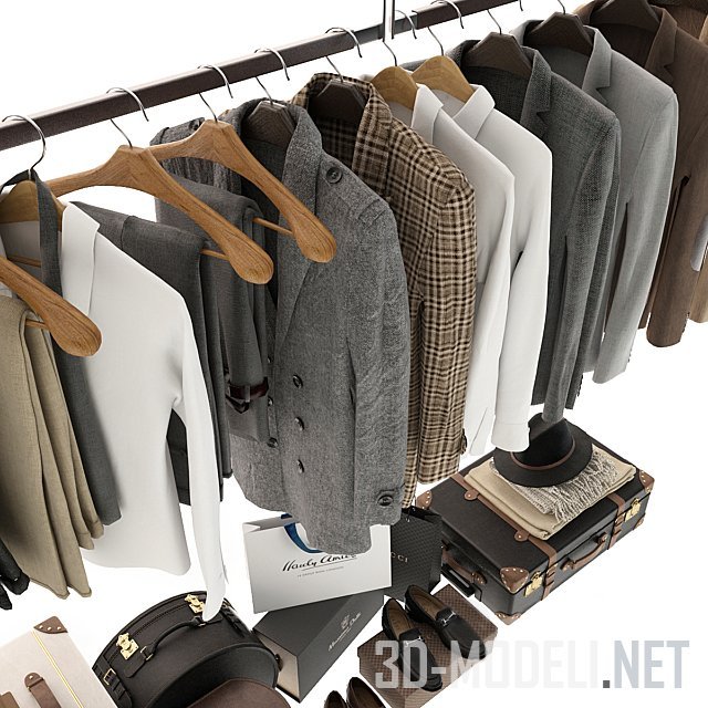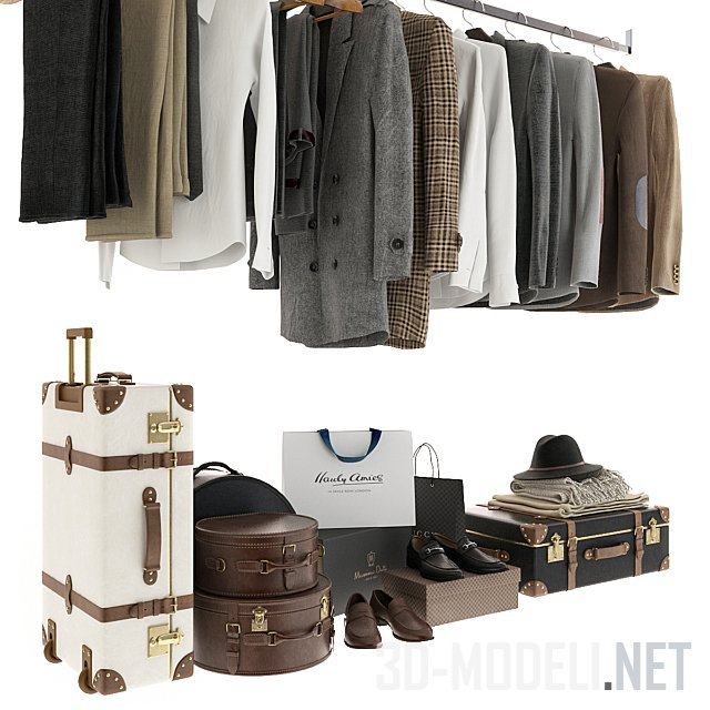 Набор для заполнения гардеробного шкафа современного мужчины. Мужская одежда (пиджаки, сорочки, брюки) на плечиках, коробки, чемоданы, пакеты, туфли, шляпа. Деревянные вешалки-плечики распределены на двух горизонтальных штангах черного цвета.