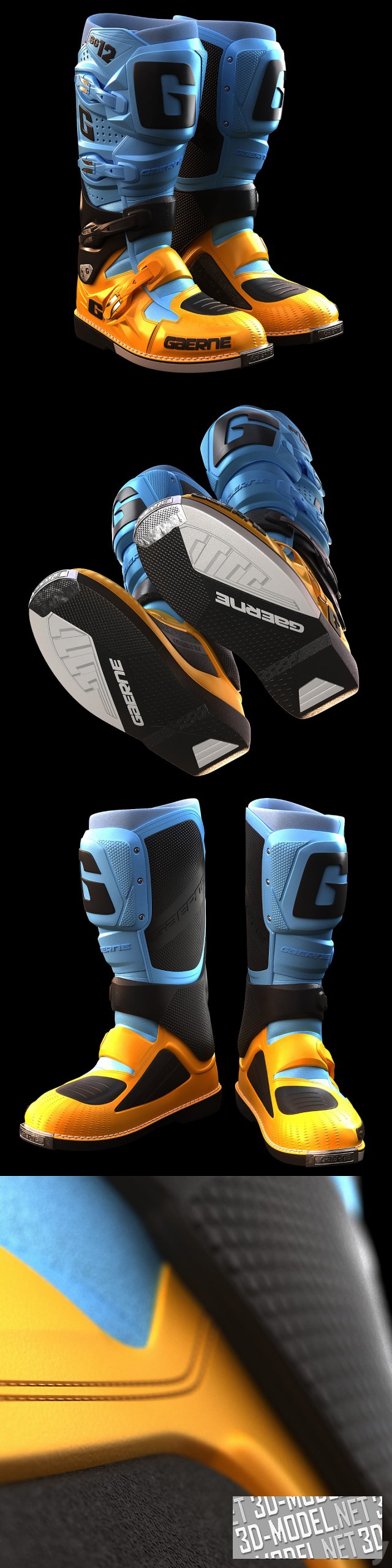 Итальянские кроссовые мотоботы от компании Gaerne, предназначены для кросс-кантри и эндуро. Мотоботы выполнены в сине-черно-желтой цветовой гамме, но с помощью текстур и материалов можно легко изменить цветовую гамму объекта. Эту обувь можно использовать как декоративную деталь при проектировании дизайна гаража, экстерьера или комнаты в стиле лофт.