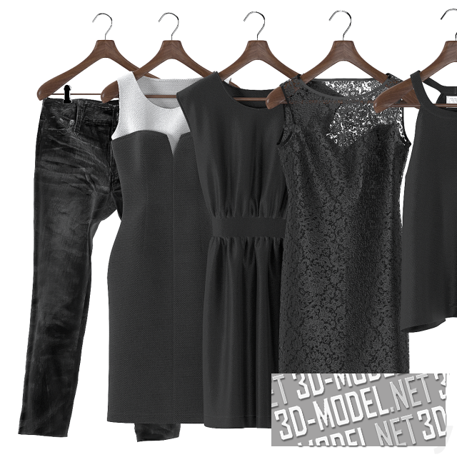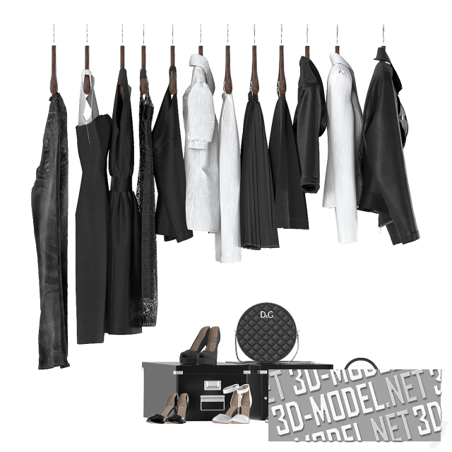 Наполнение для современного женского гардероба с одеждой, обувью и аксессуарами в черно-белых тонах. В наборе: черные джинсы, сарафаны и платья, блузки, юбки, черная кожаная куртка. Сет также содержит черные картонные коробки с хромированными ручками, дамские сумки D&G и LV, белые и черные туфли на высоком каблуке.