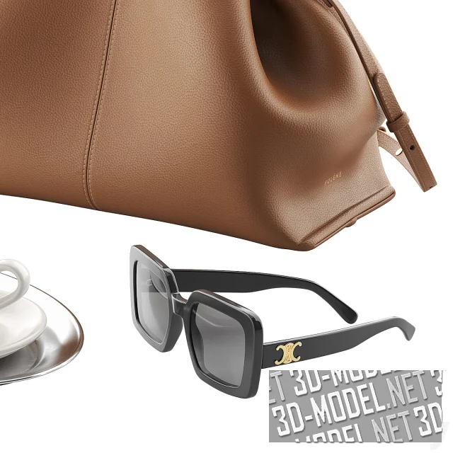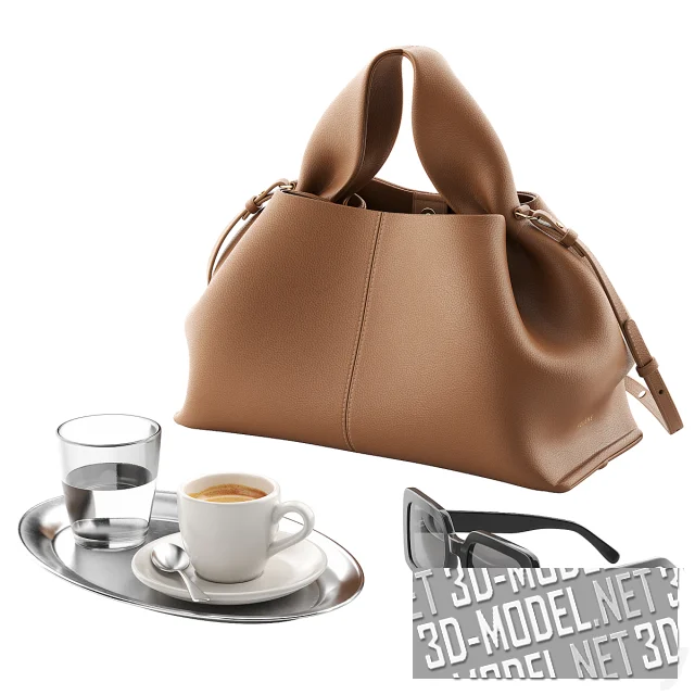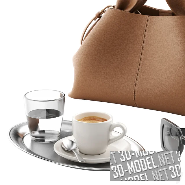 Элегантная композиция, состоит из женской сумочки, солнцезащитных очков и овального серебристого подноса с белой чашкой кофе на белом блюдце и стаканом воды. Сумка Numero Neuf от Polene (20 X 32 X 16 см), из светло-коричневой кожи, с широкой ручкой и тонким ремешком. Солнцезащитные очки в черной широкой оправе - Celine Triomphe 13.