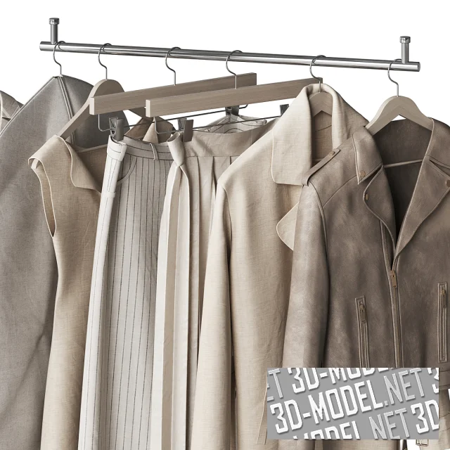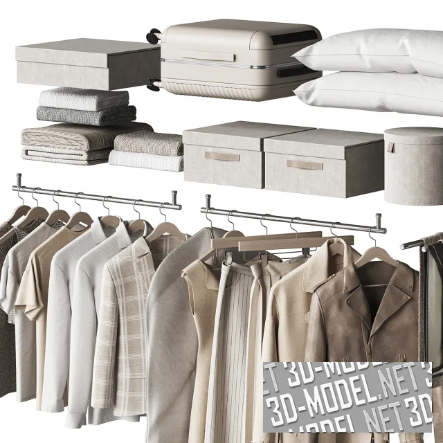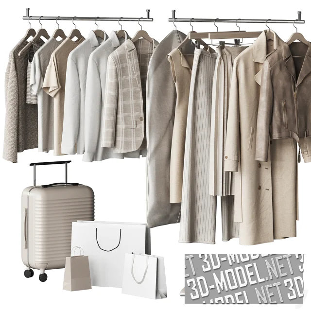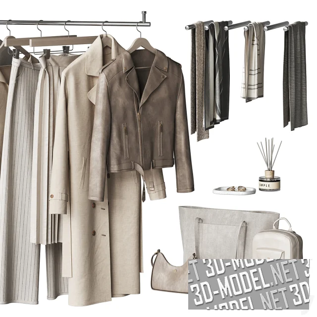 Современный набор одежды на вешалках, обуви и аксессуаров в светлых тонах, для наполнения гардеробной, витрин магазина. Кроме этого в наборе: прямоугольные и цилиндрические коробки, чемоданы, подушки, постельное белье, сумки и пакеты, аромо-диффузор в стеклянном флаконе с аромо-палочками, овальный белый подносик с бижутерией, шарфы.