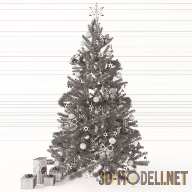 Новогодняя елка высотой 150 см, с несколькими подарочными коробками под ней. Коробки красные, перевитые золотистыми лентами и украшенные декоративными бантами. Убранство ёлки выполнено в золотисто-красных тонах. Золотая шестилучевая звезда венчает верхушку. Пышная золотая канитель спиралью обвивает тело новогодней красавицы. Различные ёлочные игрушки в виде красно-золотых колокольчиков, шаров и звёздочек разбавлены белыми снежинками и голубоватыми сосульками, и со вкусом распределены по объёму кроны. С помощью этой модели можно легко придать интерьеру праздничное настроение самого семейного из праздников, Нового Года или Рождества.