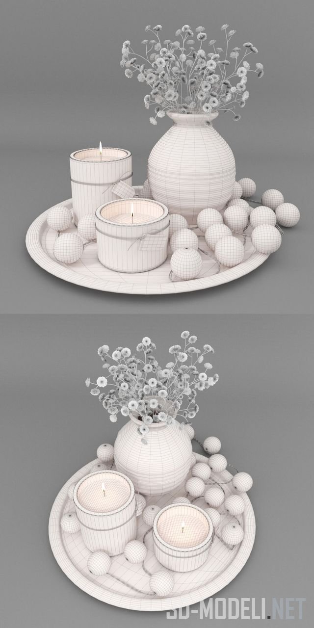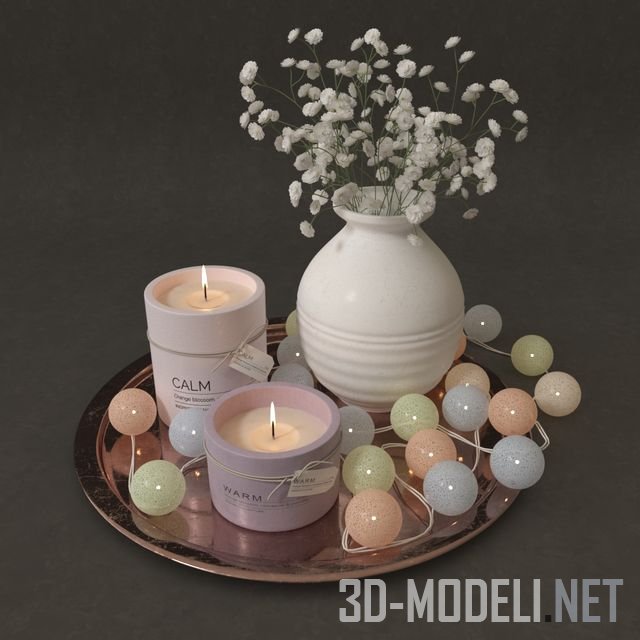 Прекрасный вариант праздничного декора для интерьера в нежных тонах. В комплекте медный сверкающий поднос, на котором стоит белая ваза с букетом нежных мелких белых цветочков. Рядом лежит новогодняя гирлянда из мелких цветных шариков нежных оттенков и стоя две свечи, нежного сиреневого цвета.