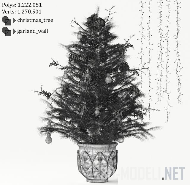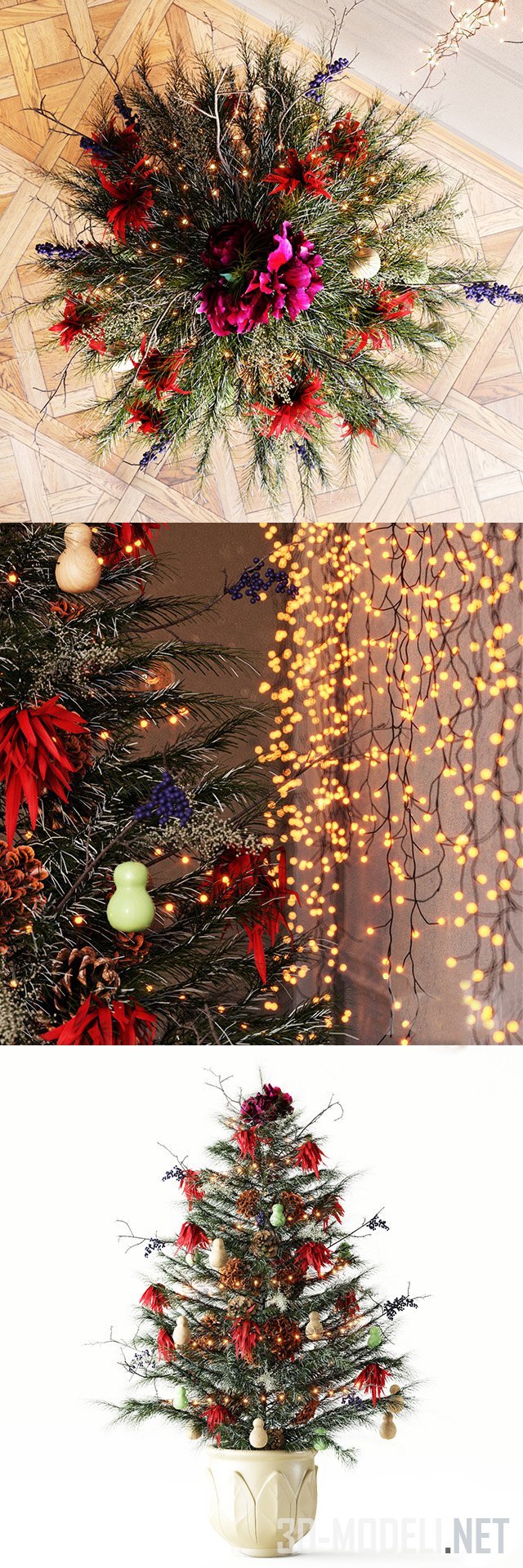 Небольшая Рождественская ель в большом белом горшке. В декоре ёлки доминируют пучки красных лепестков. Также есть шишки, грушевидные игрушки белого и зеленоватого оттенка, гроздья черных ягод. Световая гирлянда-штора размещена на фоне.