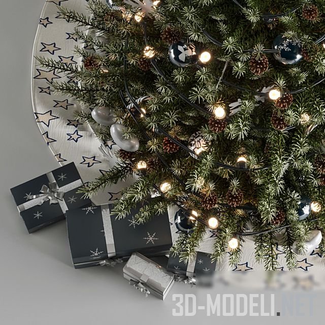 Главный элемент новогодних праздников, пушистая ель. Дерево украшено гирляндой, снежинками и сердцами серебристого цвета. С декором отлично сочетаются подарочные коробки под елкой.