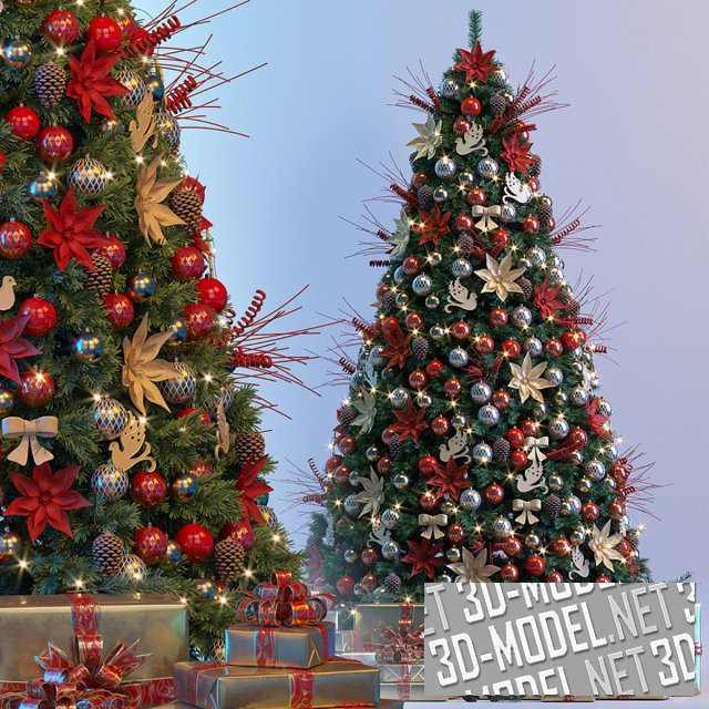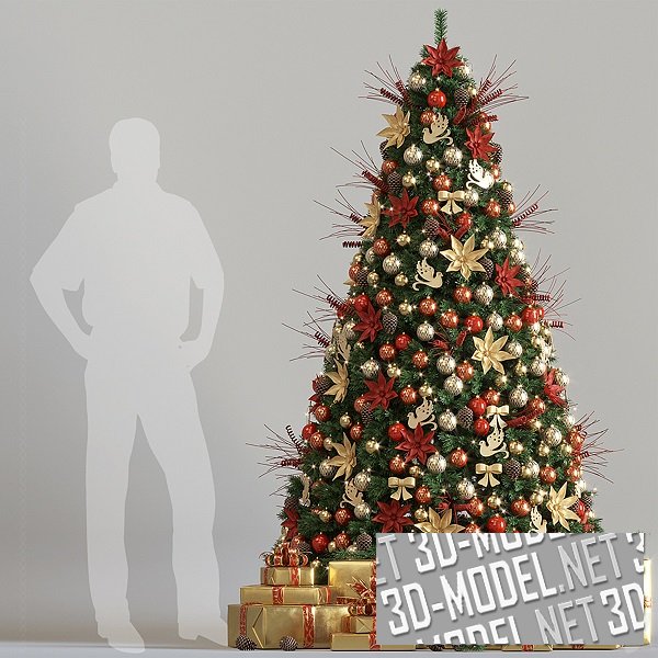 Высокая и пушистая новогодняя елка, густо украшена красными и голубыми перламутровыми шарами, бантиками, цветами, шишками и др. Вокруг основания ели лежат золотистые коробки с подарками, перевязанные красными лентами с бантами.