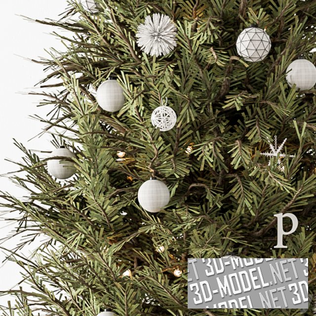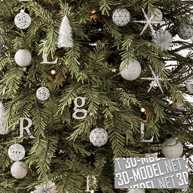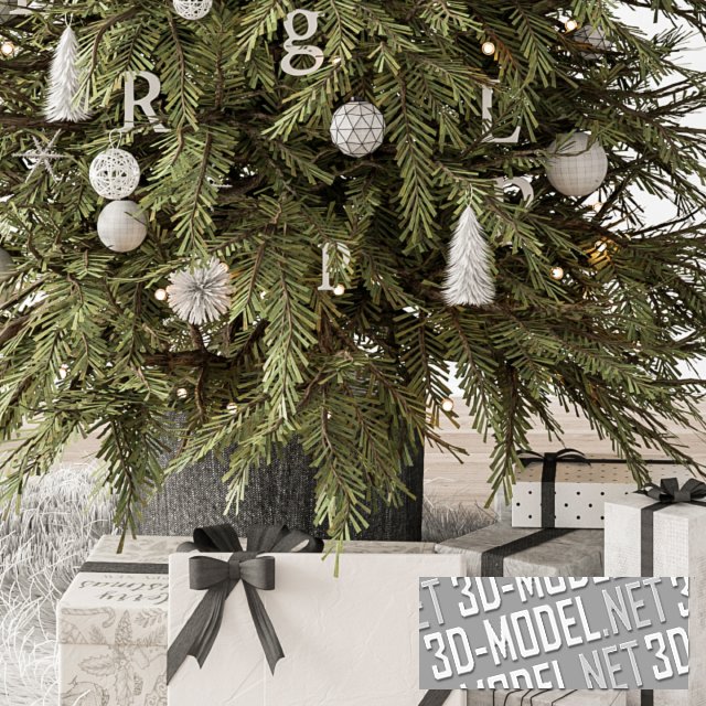 Рождественская ель с белыми елочными игрушками: шарами, снежинками, буквами и пр. У подножия елки несколько белых коробок с подарками. Коробки перевязаны шелковыми серыми лентами.