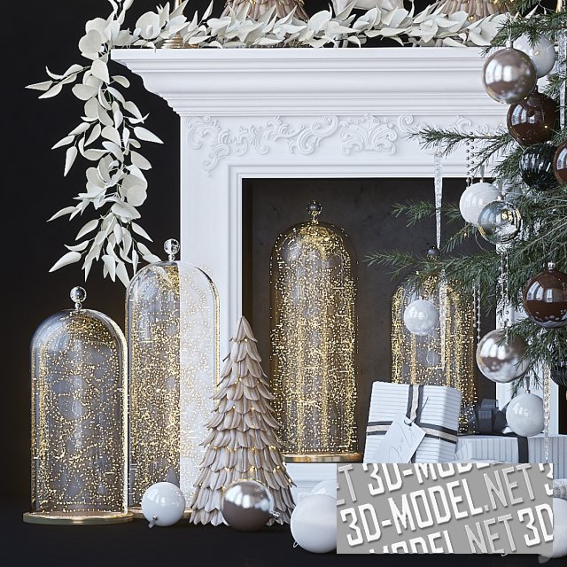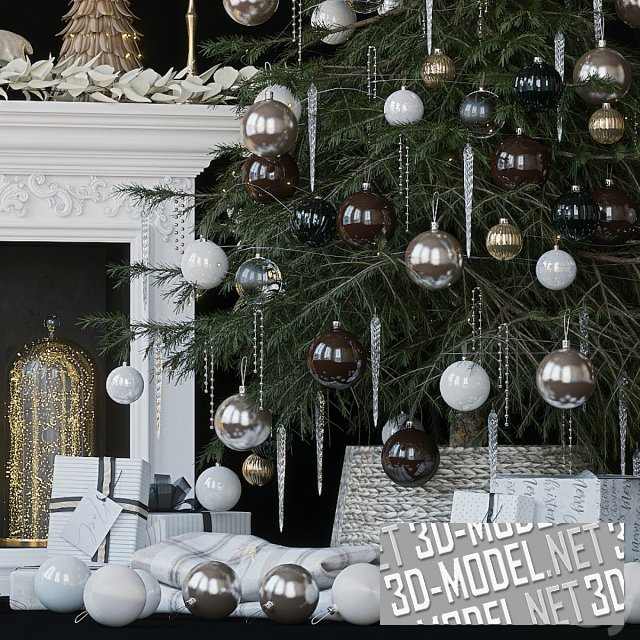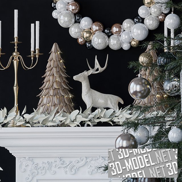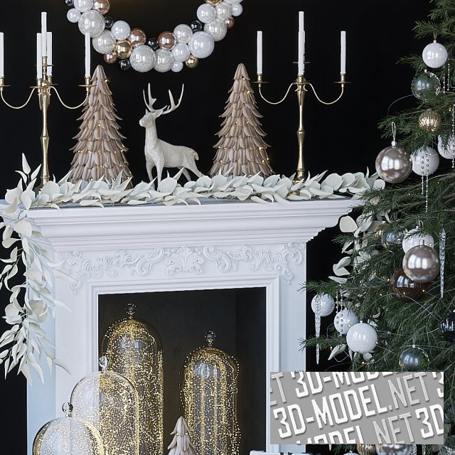 Красивая новогодняя елка, украшенная разноцветными шариками, подходящий по дизайну рождественский венок, подарки, фигурки елок и оленя, белый камин представляют собой гармоничную праздничную композицию. Высота ели 1,5 м.