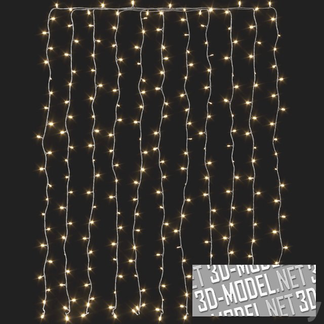 Световая штора со светодиодами теплого света. Используется для декорирования оконных проемов, фасадов зданий и стен в интерьере. Размеры: 2 500 (h) x 2 000 мм.