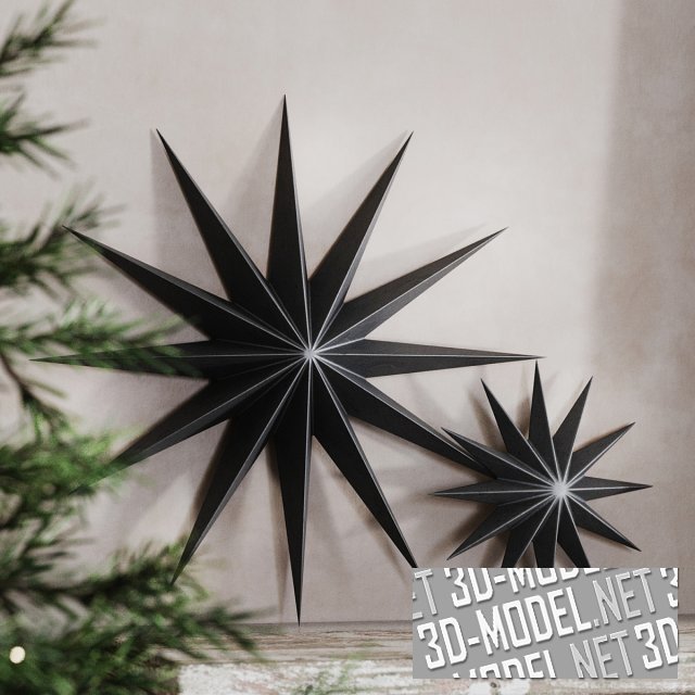 Набор Рождественского декора с нарядной елкой, украшенной гирляндой и золотистыми игрушками в виде звездочки с четырьмя лучами, рустикальным белым декоративным каминным порталом, аксессуарами и картонными коробками с подарками. Подножье ели декорировано тканью карамельного цвета. На полке камина две черные декоративные двенадцатилучевые звезды разного размера и золотистый подсвечник с белыми свечами. На стене нити с гирляндой.