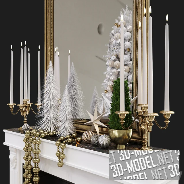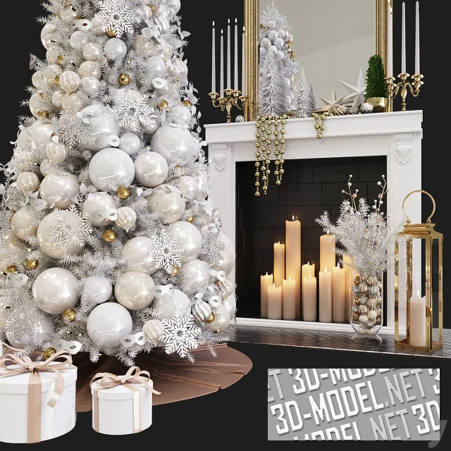 Набор праздничного декора с наряженной белой елкой, подарками, камином, свечами и новогодними игрушками. Все готово в ожидании волшебного Рождества.
