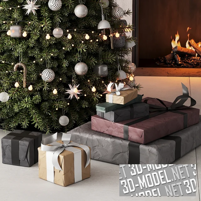 Рождественский декор с елью, подарками и камином