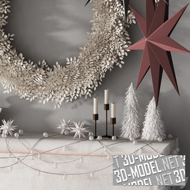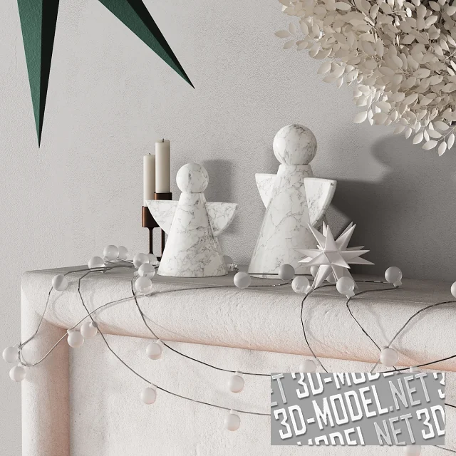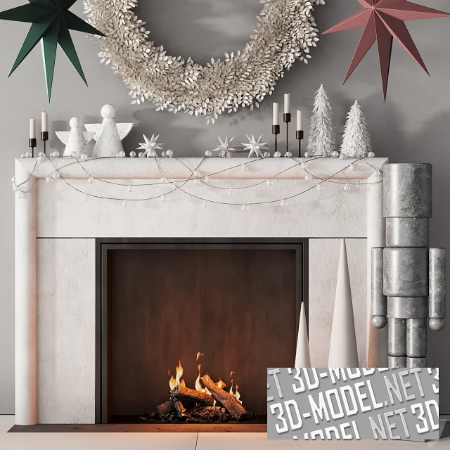 Праздничная атмосферная композиция на Новый год и Рождество. Сверкающая игрушками и гирляндами елка, подарки, камин с огнем и дровами, венок, оловянный солдатик–щелкунчик из мрамора, фигурки ангелов, свечи и другие аксессуары успешно украсят интерьер. Подвесы в форме рождественских звезд дополняют декоративную композицию.