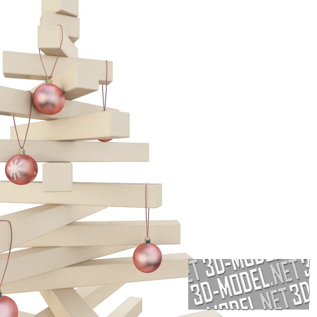 Стильная минималистичная новогодняя елочка, собранная из деревянных брусков. Бруски из светлой древесины разной длины, одинакового квадратного сечения, набраны горизонтально на центральную вертикальную спицу, закрепленную на квадратной площадке. Длинные снизу и укорачивающиеся кверху, элементы размещены на спице в разных положениях, в массе составляя подобие пирамиды. Новогоднее «дерево» украшено серебрито-красными елочными шарами. Габарит елки: 80х60см.
