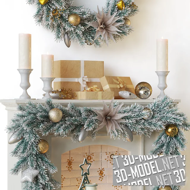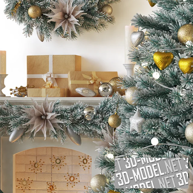 Эстетичный набор для Рождественского интерьера. В комплекте: декоративный каминный портал белого цвета с несколькими белыми свечами, пышная нарядная новогодняя елка, настенный венок и гирлянда из еловых веток на камине, серый вязаный коврик овальной формы, подарки в крафтовой бумаге с белой лентой, белые подсвечники с толстыми свечами, круглая плетеная корзина с елочными украшениями, напольный кованый подсвечник в виде новогодней елки. Елочные украшения и элементы подобраны в сочетаниях золотистого и серебристого.