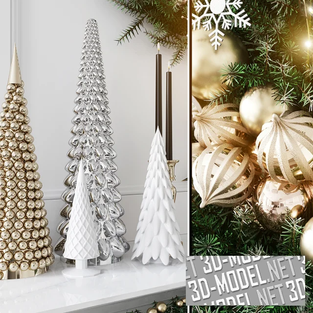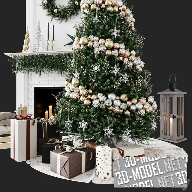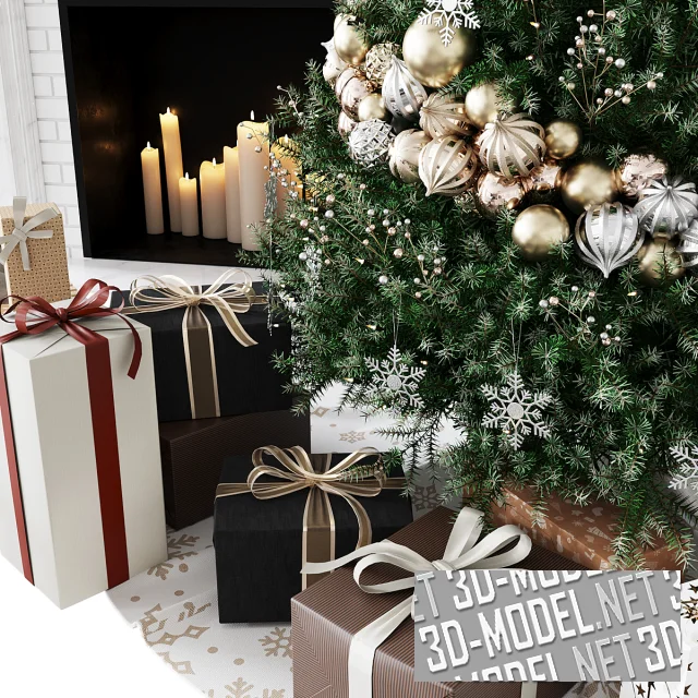 Праздничная композиция с новогодней елкой и камином, создает атмосферу уюта и тепла в интерьере. Роскошная зеленая елка украшена шарами золотого, серебристого и бронзового оттенков, дополнена снежинками и веточками с жемчужными элементами. Под ней находятся аккуратно упакованные подарки в изысканной цветовой гамме, с бантами, которые придают сцене особое праздничное настроение. Камин украшен еловыми гирляндами, свечами и декоративными елочками, создавая ощущение гармонии и домашнего комфорта.