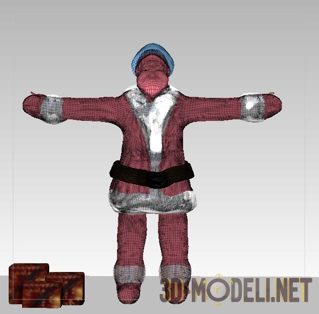 3d модель фигурки Санта Клауса, стоящего во весь рост, с раскинутыми в стороны руками. На нем традиционный красный кафтан с белой опушкой, красные штаны и шапочка, черные башмаки и черный пояс. Слева от фигурки три подарочных коробки, перевязанные лентами. Незаменимая модель в период новогодних праздников!