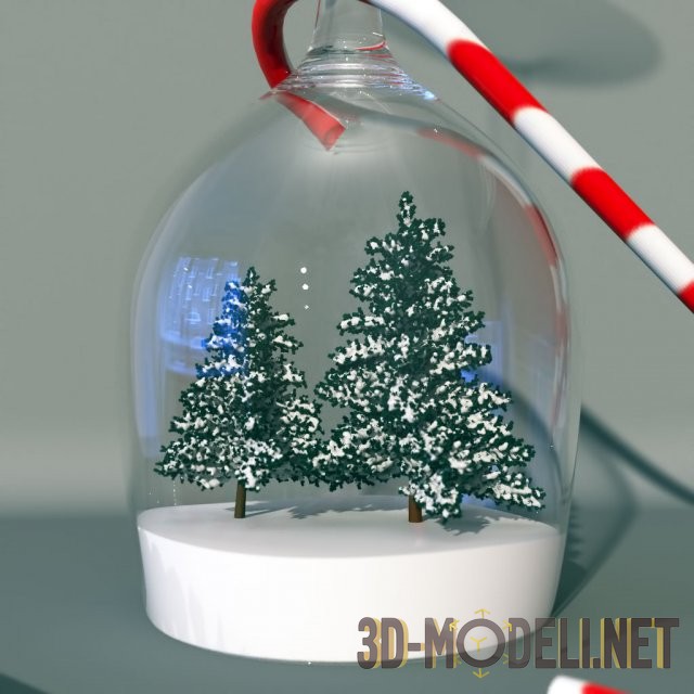 3D модель большого стеклянного прозрачного бокала на длинной ножке, с новогодней инсталляцией внутри. Бокал стоит на горлышке, плотно закрытым белым кружком, имитирующим снежную поверхность. На ней две очаровательные зеленые елочки, припорошенные снежком. На бокал нацеплена загнутой частью длинная тонкая красно-белая марципановая конфета, такая же конфета лежит рядом с бокалом. Бокал будет отличным декоративным дополнением к новогоднему столу. Текстура есть.