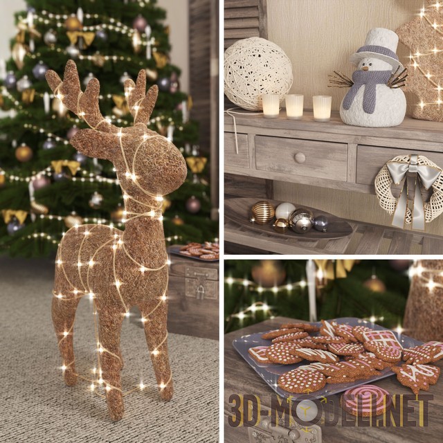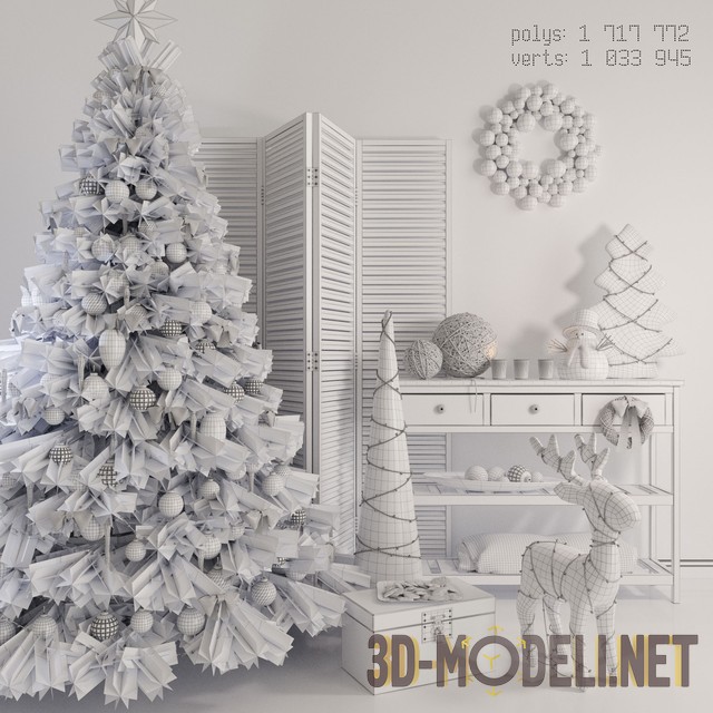 3D модель чудесной рождественской композиции со всеми ее компонентами. Тут и высокая зеленая ель с белой восьмиконечной звездой на верхушке, украшенная разноцветными шарами и гирляндами белых лампочек, и конусообразная елочка и олень из светло-коричневого кокосового волокна, с гирляндами лампочек, и имбирное печенье в плоской тарелке, стоящей на очаровательном небольшом деревянном сундучке. В композиции также присутствует высокая деревянная ширма и светло-коричневый небольшой столик в скандинавском стиле. На столике находятся два клубка из белых ниток, плоская фигурка елочки из кокосового волокна с гирляндой лампочек, три белых подсвечника и снеговик. На стене висит веночек из разноцветных сверкающих шаров, а на столике маленький вязаный веночек с бледно голубым шелковым бантом. Качественная и детальная модель с текстурами и материалами.