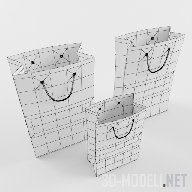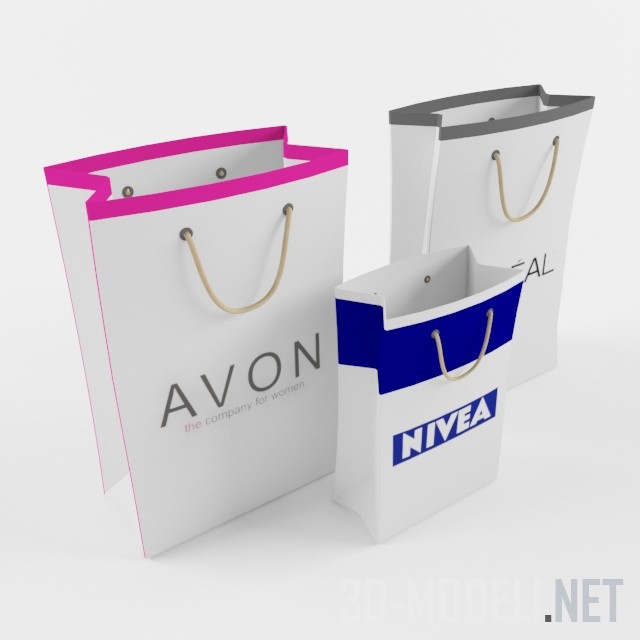 Три современных бумажных пакета, украшенных логотипами известных косметических брендов: Avon, Nivea, Loreal. Текстуры присутствуют.