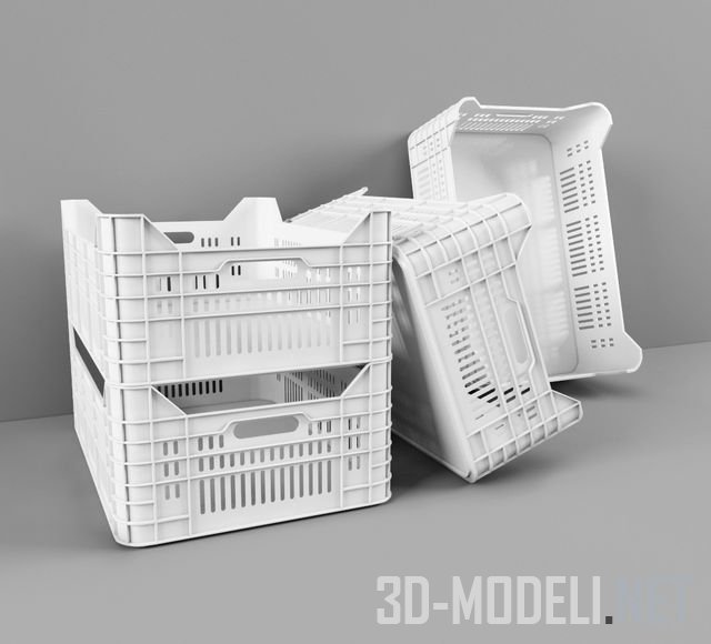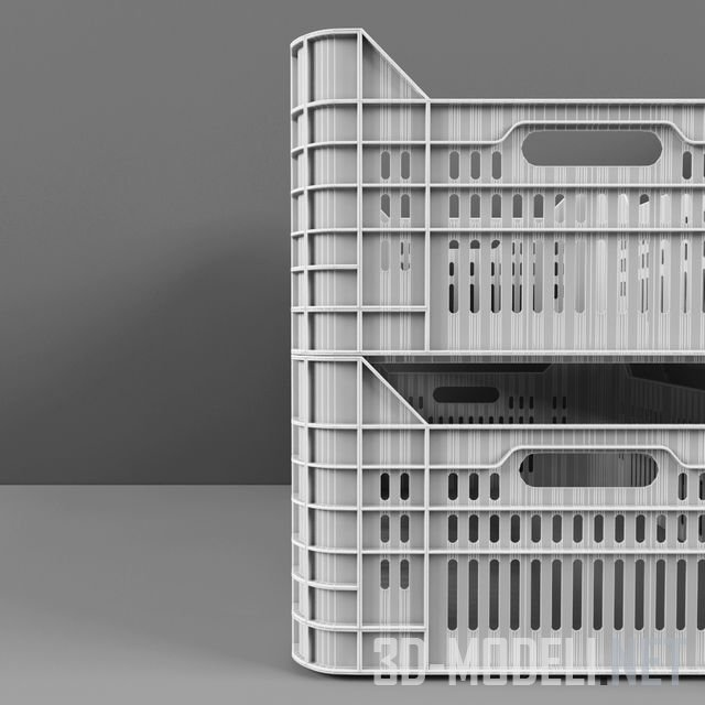 Современный продуктовый ящик из белого пластика. По коротким бортам устроены прорези для рук. Дно - сплошное. Борта изготовлены с вертикальными прорезями и множеством небольших ребер жесткости. Ящики используются для молочных, мясных продуктов, колбасных изделий, овощей-фруктов и многого другого.