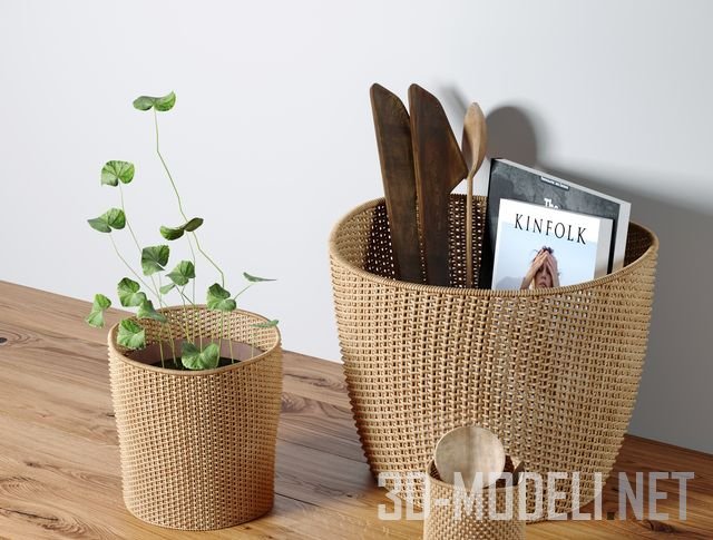 Декоративный сет, содержит три корзины разных размеров, фотоальбом, набор журналов Kinfolk, растение в горшке и деревянные ложки.
