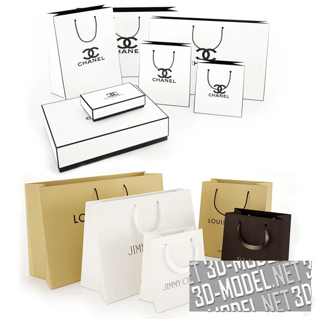 Набор бумажных пакетов с логотипами известных брендов. Аксессуары имеют следующие названия: Tsum, Chanel, Dior, Armani, Gucci, Hugo Boss, Jimmy Choo, Lui vuitton, Mac, Marco polo, Bottega.