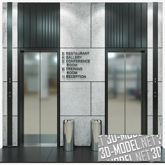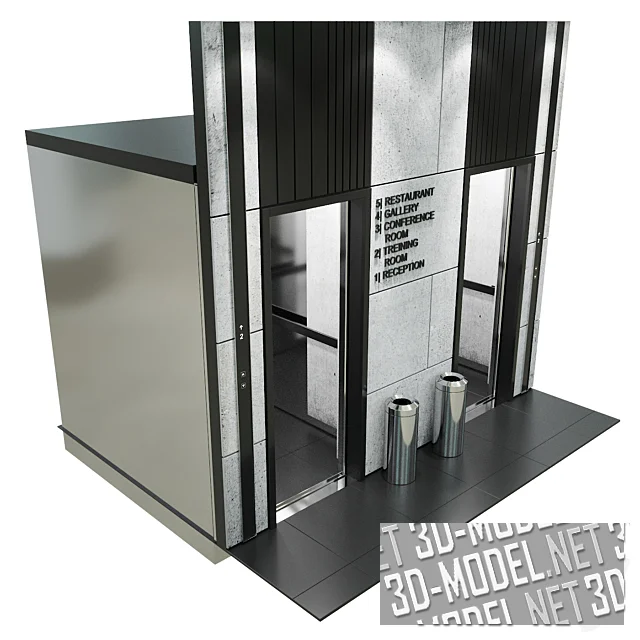 Трехмерная модель выполнена с высокой степенью детализации: проработаны дверные проемы, внутренняя облицовка кабин, кнопочные панели, надписи и материалы камня, металла и стекла. Такой объект удобен для универсального использования, его можно интегрировать в архитектурные визуализации, интерьерные проекты общественных пространств, а также в игровые уровни, симуляторы и другие интерактивные приложения.