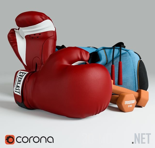Набор для создания спортивного акцента. В комплекте ярко-голубая спортивная сумка, на которой лежат красные боксерские перчатки и торчит скакалка с красными ручками. Возле сумки лежат небольшие гантели оранжевого цвета.