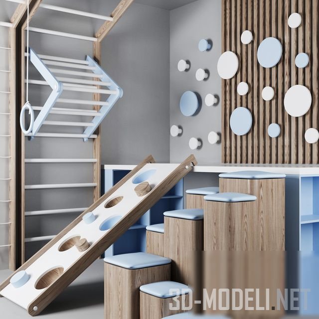 Спортивно-игровой комплекс для детей. В комплекс входят: две шведских стенки, одна с традиционными планками, другая с веревочной лесенкой, кольца, перекладина, тумбы разной высоты, мячи и пандус с отверстиями.