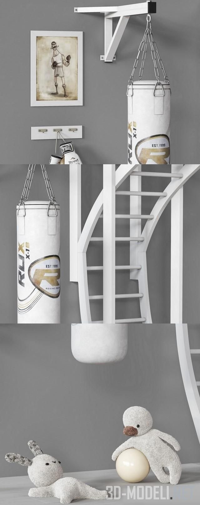 Детский спортивный комплекс для дома, Woodbro «МАКСИ-С. Размеры: ширина 800 мм, высота 2400 мм, глубина 1100 мм. В комплекте стойка для мячей FRAME, настенный кронштейн - держатель груши и груша, боксерские перчатки, плакат, мяч, а также мягкие игрушки «Заяц» и «Утконос».
