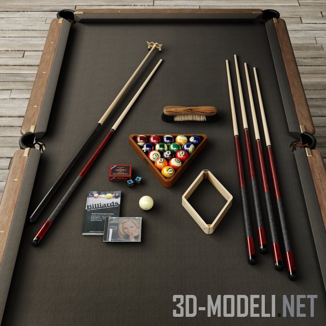 Винтажный бильярдный стол BRUNSWICK VINTAGE от бренда Restoration Hardware. Стол стоит на массивных ножках и обтянут сукном коричневого цвета. На поверхности стола лежат: набор из 16 цветных шаров для пула, несколько киев длиной 58 футов, рест, деревянные подставки для шаров, кисточки для стола, мелки и официальная книга правил BCA.