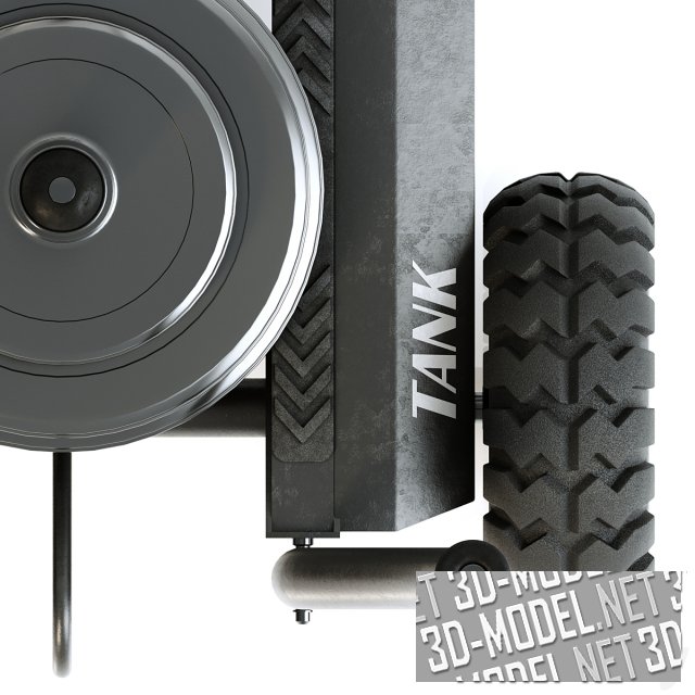 Современный снаряд для занятия силовыми тренировками - Power Tank. Тележка на четырех мощных колесах оснащена четырьмя вертикальными ручками и штырями для навешивания блинов для штанги. По коротким сторонам оборудованы металлические петли для крепления каната. Габарит устройства: 113х110х152см.