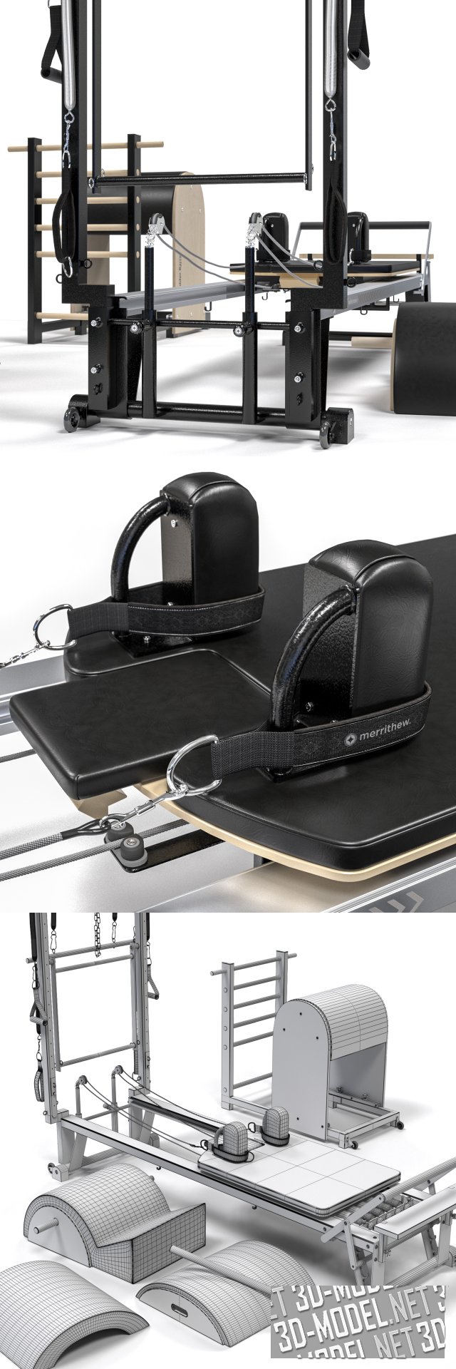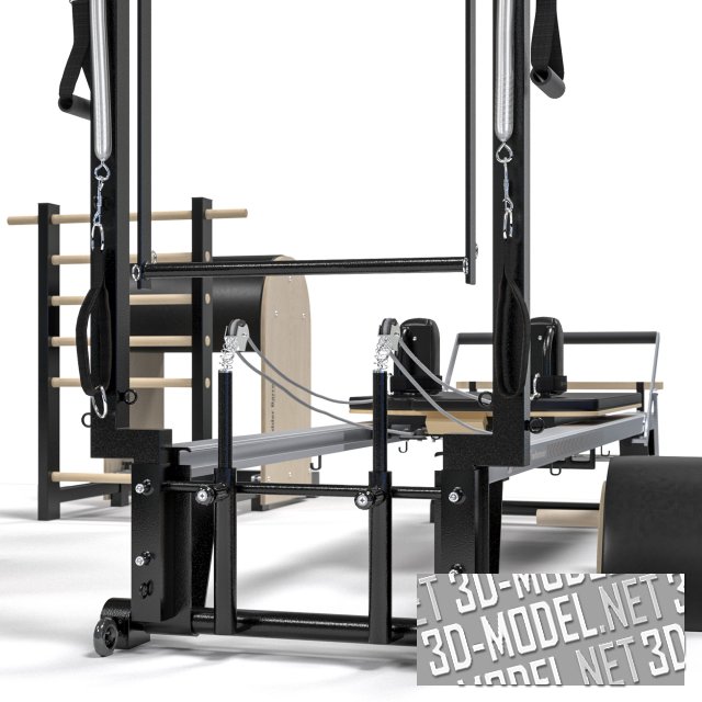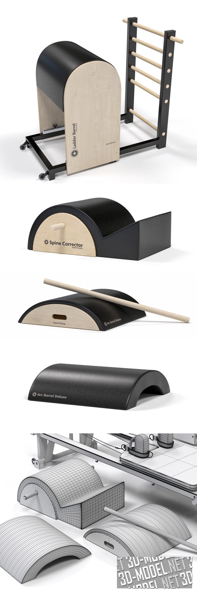 Набор профессионального спортивно-медицинского оборудования для коррекции спины и осанки от канадского производителя Merrithew. Станки и оборудование выполнены из черного пластика, металла и элементов из обработаной древесины с очень светлой текстурой. В наборе: реформер с вертикальной рамкой V2 Max Plus Reformer (габарит рамы: 77,5х187см; габарит каретки 61х98х40,6см); корректор спины Spine Corrector (55/81x78x30.5см); лестница с бочкой Ladder Barrel (59,69/81,28х111,76х99,06см); арки для пилатеса Arc Barrel (57.15x60x15.24см) и Arc Barrel Deluxe (57.15x60x15.24см); гимнастическая палка Maple Roll-Up Pole (d3,2см, L91.4см).